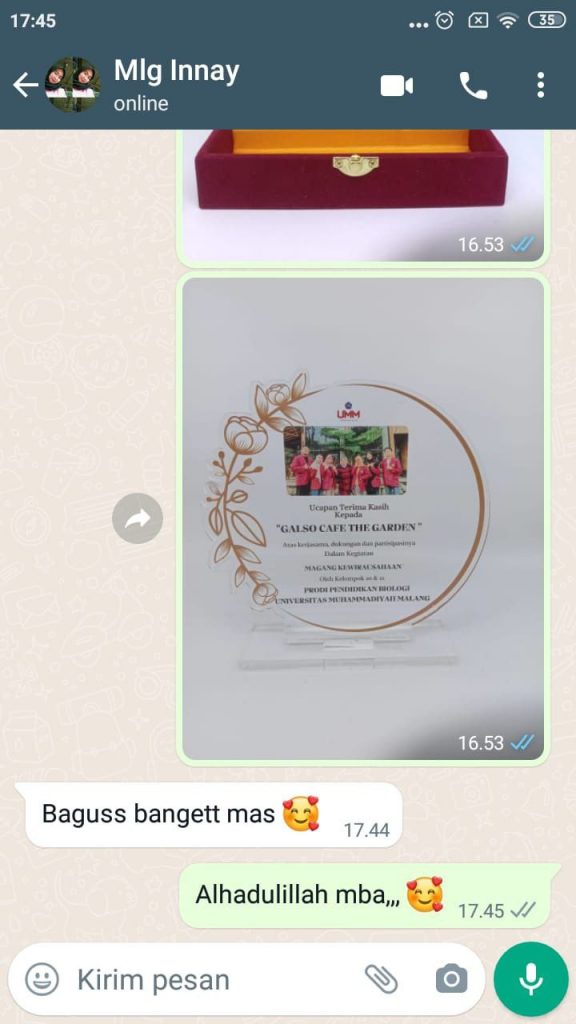 Plakat bisa menjadi suatu pilihan yang tepat untuk dijadikan sebagai simbol peristiwa. Selain harganya yang terjangkau, proses pengerjaannya pun tidak memakan waktu yang lama. Bukan hanya itu saja yang menjadi kelebihan dari plakat berbahan akrilik. Benda yang satu ini sangat irngan dan tidak berat saat dipegang. Sehingga, sangat praktis digunakan dalam berbagai acara.